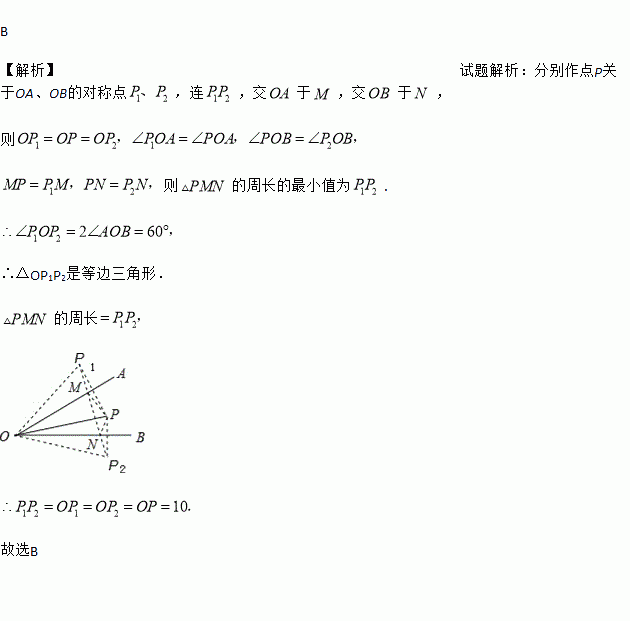 B 【解析】试题解析:分别作点P关于OA、OB的对称点,连,交于,交于, 则 则的周长的最小值为. ∴△OP1P2是等边三角形. 的周长 故选B
