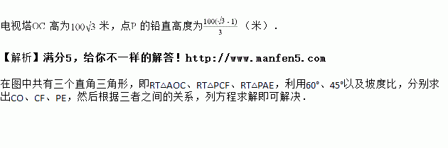 如图,某人在山坡坡脚A处测得电视塔尖点C的仰角为60°,沿山坡向上走到P处再测得点C的仰角为45°,已知OA=100米,山坡坡度(竖直高度与水平宽度的比)i=1:2,且O、A、B在同一条直线上.求电视塔OC的高度以及此人所在位置点P的铅直高度.(测倾器高度忽略不计,结果保留根号形式)