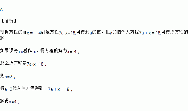 王涵同学在解关于x的方程7a+x=18时,误将+x看作-x,得方程的解为x=-4,那么原方程的解为( )