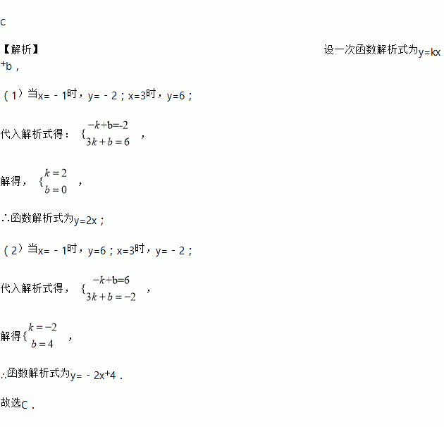 C 【解析】设一次函数解析式为y=kx+b, (1)当x=﹣1时,y=﹣2;x=3时,y=6; 代入解析式得: , 解得, , ∴函数解析式为y=2x; (2)当x=﹣1时,y=6;x=3时,y=﹣2; 代入解析式得, , 解得, ∴函数解析式为y=﹣2x+4. 故选C.