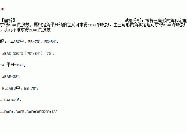 如图,△ABC中,AD⊥BC,AE平分∠BAC,∠B=70°,∠C=34°.则∠DAE的大小是____度.
