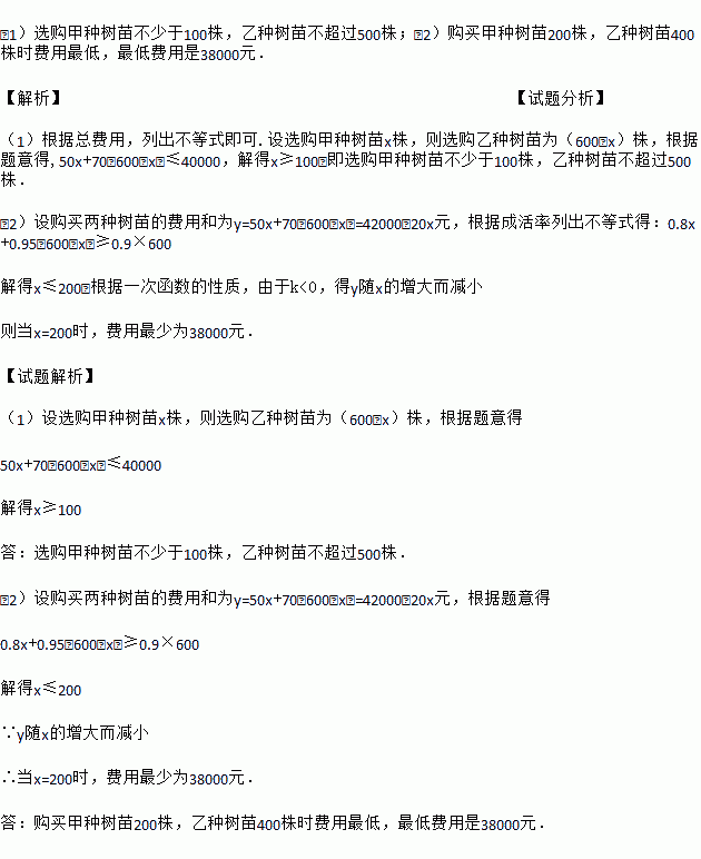 (1)选购甲种树苗不少于100株,乙种树苗不超过500株;(2)购买甲种树苗200株,乙种树苗400株时费用最低,最低费用是38000元. 【解析】【试题分析】 (1)根据总费用,列出不等式即可.设选购甲种树苗x株,则选购乙种树苗为(600﹣x)株,根据题意得,50x+70(600﹣x)≤40000,解得x≥100,即选购甲种树苗不少于100株,乙种树苗不超过500株. (2)设...