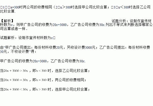 2017年5月14日至15日,“一带一路”国际合作高峰论坛在北京举行,本届论坛期间,中国同30多个国家签署经贸合作协议,顺德区政府招商办准备引荐本区的龙头企业与 “一带一路”沿线国家和地区合作.负责人要为这些企业制作一批宣传材料,联系了甲、乙两家设计公司,甲公司提出:每份材料收费20元,另加设计费3000元;乙公司提出:每份材料收费30元,不收设计费.在其他条件完全相同的情况下,区招商负责人选择哪间公司比较合算?