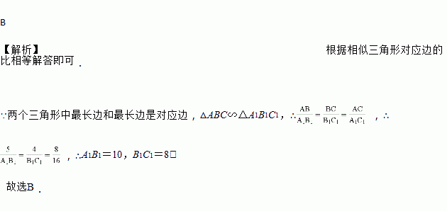 在△ABC中,已知AB=5,BC=4,AC=8.若△ABC∽△A1B1C1,△A1B1C1的最长边的长为16,则其他两边的长分别为( )