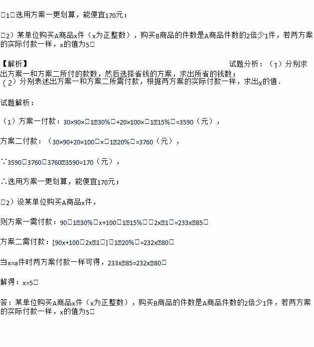 (1)某单位购买A商品30件,B商品20件,选用何种方案划算?能便宜多少钱?