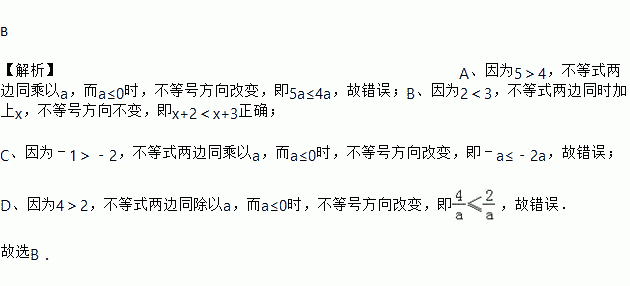 A. 5a>4a B. x+2<x+3 C. ﹣a>﹣2a D. ![]()
