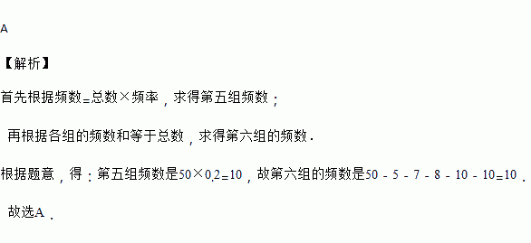 一组数据共50个,分为6组,第一组的频数为5,第二组的频数为7,第三组的频数为8,第四组的频数为10,第五组的频率是0.2,则第六组的频数是( )