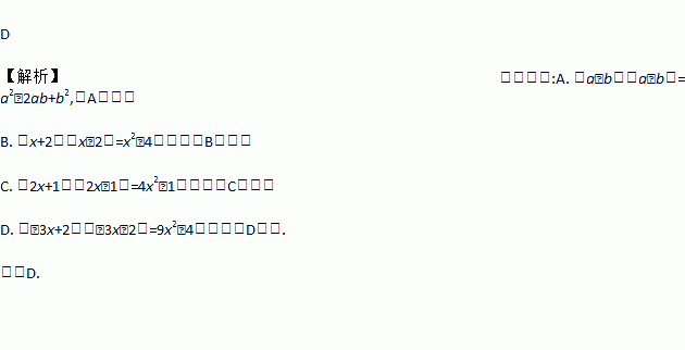 C. (2x+1)(2x﹣1)=2x2﹣1 D. (﹣3x+2)(﹣3x﹣2)=9x2﹣4
