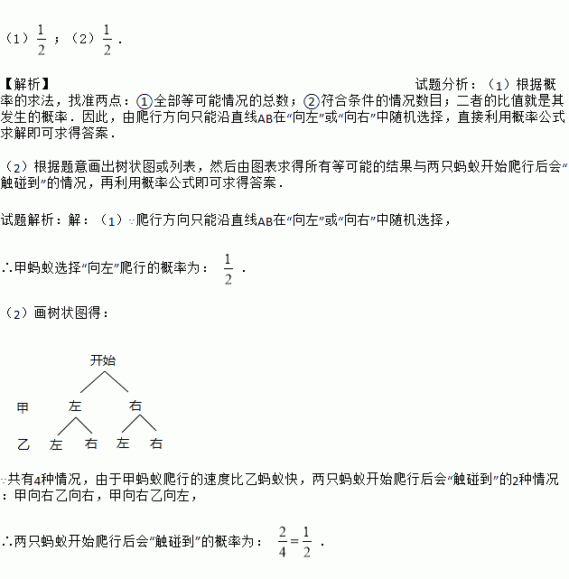 (1);(2). 【解析】试题分析:(1)根据概率的求法,找准两点:①全部等可能情况的总数;②符合条件的情况数目;二者的比值就是其发生的概率.因此,由爬行方向只能沿直线AB在“向左”或“向右”中随机选择,直接利用概率公式求解即可求得答案. (2)根据题意画出树状图或列表,然后由图表求得所有等可能的结果与两只蚂蚁开始爬行后会“触碰到”的情况,再利用概率公式即可求得答案. 试题解析:...