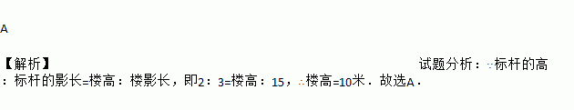 A 【解析】试题分析:∵标杆的高:标杆的影长=楼高:楼影长,即2:3=楼高:15,∴楼高=10米.故选A.