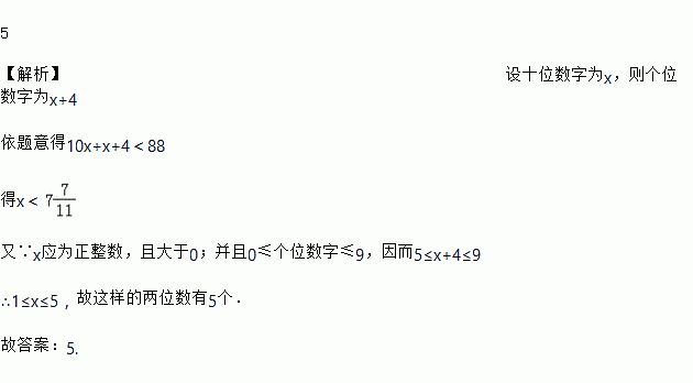 小于88的两位正整数,它的个位数字比十位数字大4,这样的两位数有_________个.