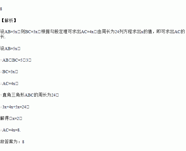 如图,直角三角形ABC的周长为24,且AB:BC=5:3,则AC= __________.