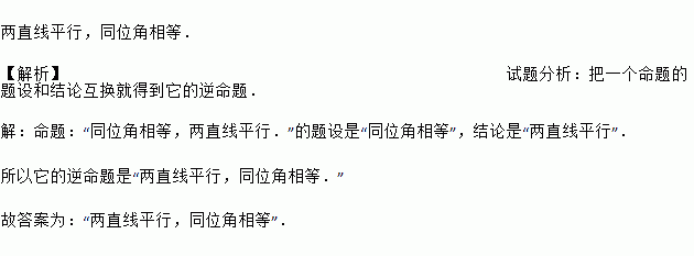两直线平行,同位角相等. 【解析】试题分析:把一个命题的题设和结论互换就得到它的逆命题. 【解析】 命题:“同位角相等,两直线平行.”的题设是“同位角相等”,结论是“两直线平行”. 所以它的逆命题是“两直线平行,同位角相等.” 故答案为:“两直线平行,同位角相等”.