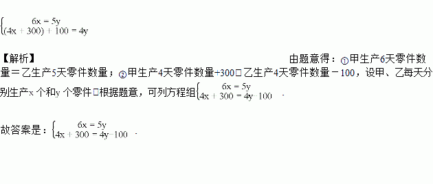 甲、乙两人共同生产某种零件,若甲先生产1天,然后两人又一起生产了5天,则两人生产数量相同;若甲先生产300个,然后两人同时生产4天,则乙比甲多生产100个零件.设甲、乙每天分别生产x个和y个零件,根据题意,可列方程组__________.