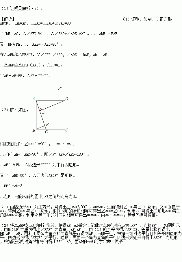 (2)将△ABF绕点A逆时针旋转,使得AB与AD重合,记此时点F的对应点为点F′,若正方形边长为3,求点F′与旋转前的图中点E之间的距离.