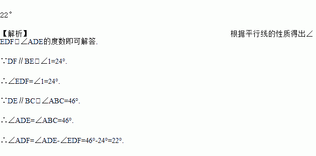 如图,在△ABC 中,点 D 在边 AB 上,点 E,F 分别在边 AC 上,且满足 DF∥BE,DE∥BC,若∠ABC=46°,∠1=24°,则∠ADF 的度数是________.