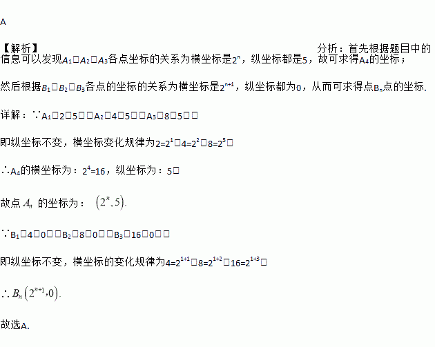 如图,在直角坐标系中,第一次将△OAB变换成△OA1B1,第二次将△OA1B1变换成△OA2B2,第三次将△OA2B2变换成△OA3B3,已知A(1,5) 、A1(2,5) 、A2(4,5) 、A3(8,5) 、B(2,0) 、B1(4,0) 、B2(8,0) 、B3(16,0):若按此规律,将△OAB进行n次变换,得到△OAnBn。推测An的坐标是___________,Bn的坐标是___________。( )