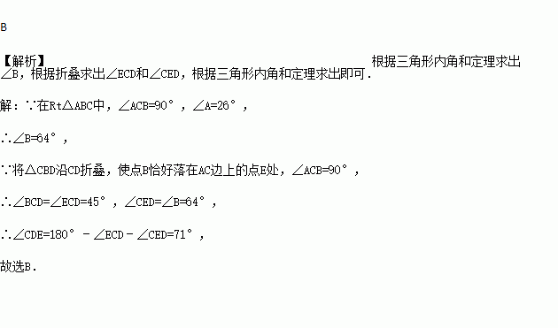 如图,在Rt△ABC中,∠ACB=90°,点D在AB边上,将△CBD沿CD折叠,使点B恰好落在AC边上的点E处,若∠A=26°,则∠CDE度数为( )