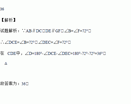 如图,点B,C,E,F在一直线上,AB∥DC,DE∥GF,∠B=∠F=72°,则∠D=_____度.