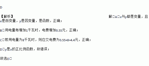 D 【解析】解:A.x与y都是变量,且x是自变量,y是因变量,是函数,正确; B.用电量每增加1千瓦时,电费增加0.55元,正确; C.若用电量为8千瓦时,则应交电费为0.55×8=4.4元,正确; D.y是x的正比例函数,故错误; 故选D.