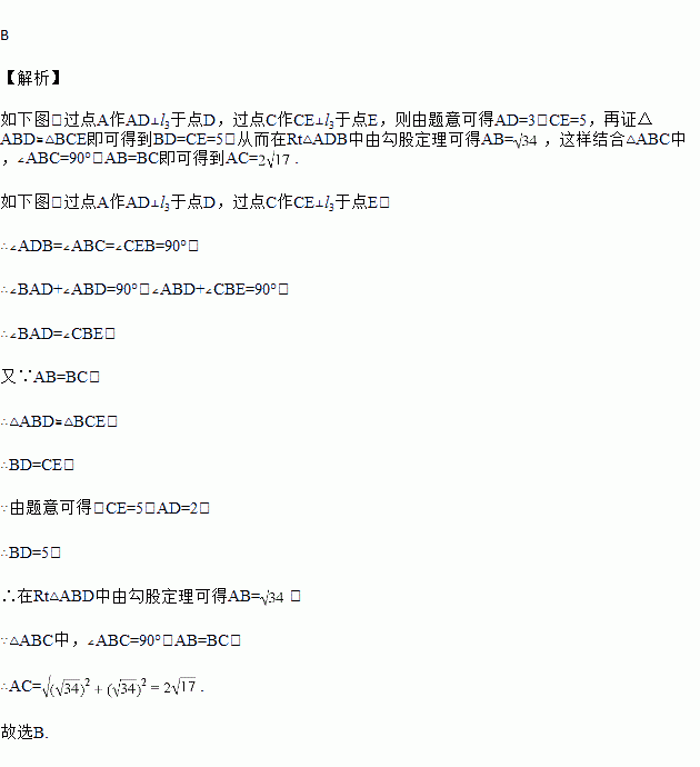 如图,△ABC中,∠ABC=90°,AB=BC,三角形的顶点在相互平行的三条直线l1,l2,l3上,且l1,l2之间的距离为2,l2,l3之间的距离为3,则AC的长是( )