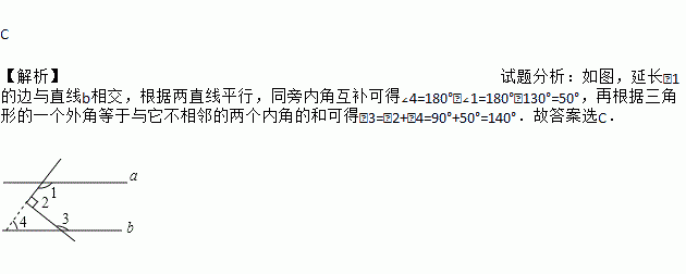 如图,已知a∥b,∠1=130°,∠2=90°,则∠3=( )