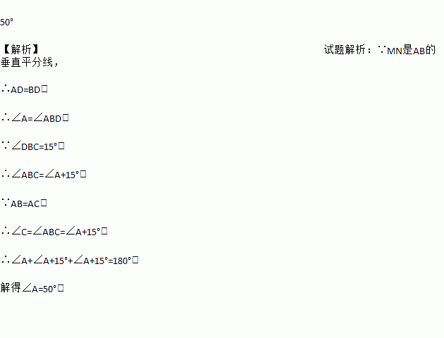 如图,等腰三角形中, , , 的垂直平分线交于点,则的度数是_________.