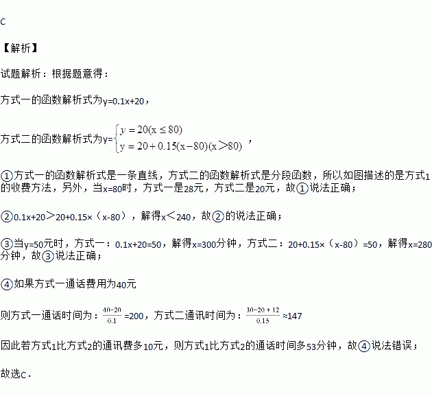 某通讯公司提供了两种移动电话收费方式:方式1,收月基本费20元,再以每分钟0.1元的价格按通话时间计费;方式2,收月基本费20元,送80分钟通话时间,超过80分钟的部分,以每分钟0.15元的价格计费.