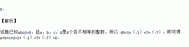 4个各不相等的整数a、b、c、d,它们的积abcd=49,那么a+b+c+d 的值是 .