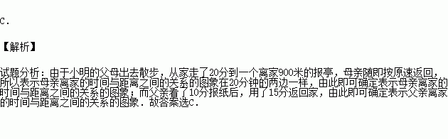 如图,小明的父母出去散步,从家走了20分钟到一个离家900米的报亭,母亲随即按原速度返回家,父亲在报亭看了10分钟报纸后,用15分钟返回家,则分别表示父亲、母亲离家距离与时间之间关系的是( )