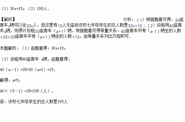 (2)现决定租用40座客车,则可比原计划租30座客车少一辆,且所租40座客车中有一辆没有坐满,只坐35人,求出该校七年级学生的总人数.