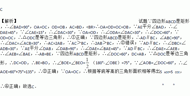如图,在矩形ABCD中,AE平分∠BAD交BC于E,∠CAE=15°,则下面的结论: