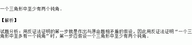 一个三角形中至少有两个钝角. 【解析】 试题分析:用反证法证明的第一步就是作出与原命题相矛盾的假设,因此用反证法证明“一个三角形中至多有一个钝角”时,第一步应假设一个三角形中至少有两个钝角.