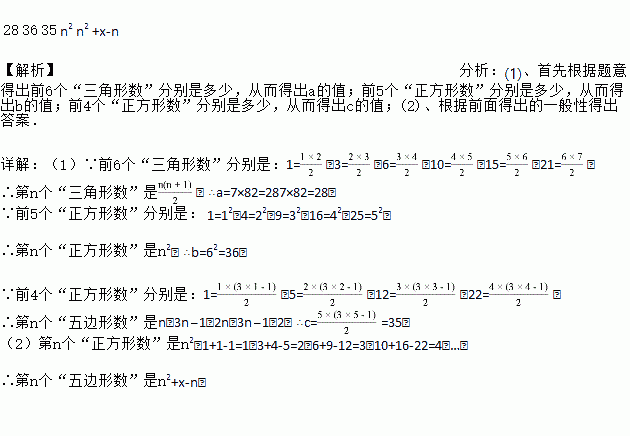 (2)观察表中规律,第n个“正方形数”是________;若第n个“三角形数”是x,则用含x、n的代数式表示第n个“五边形数”是___________.