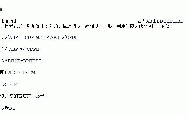 如图是小王设计用手电来测量“新华大厦”高度的示意图.她站到大厦顶端,光线从点C出发经平面镜反射后刚好射到楼下的电线杆上A处,已知 AB⊥BD,CD⊥BD, 且测得AB=1.2米,BP=1.8米,PD=24米,那么该大厦的高度约为( )(不考虑小王自身高度)