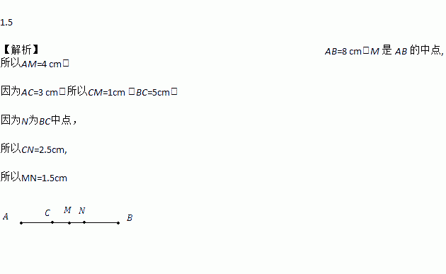 1.5 【解析】AB=8 cm,M 是 AB 的中点,所以AM=4 cm, 因为AC=3 cm,所以CM=1cm ,BC=5cm, 因为N为BC中点, 所以CN=2.5cm, 所以MN=1.5cm