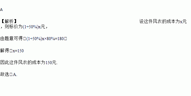 一件风衣,按成本价提高50%后标价,后因季节关系按标价的8折出售,每件卖180元,这件风衣的成本价是( )