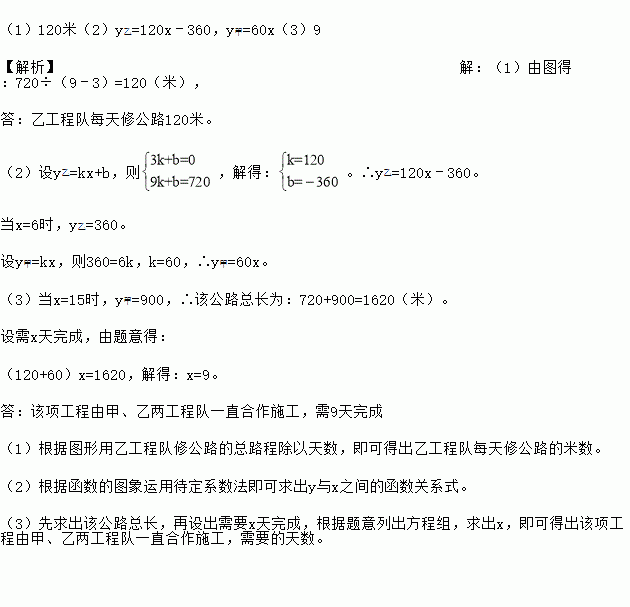 在社会主义新农村建设中,衢州某乡镇决定对A、B两村之间的公路进行改造,并有甲工程队从A村向B村方向修筑,乙工程队从B村向A村方向修筑.已知甲工程队先施工3天,乙工程队再开始施工.乙工程队施工几天后因另有任务提前离开,余下的任务有甲工程队单独完成,直到公路修通.下图是甲乙两个工程队修公路的长度y(米)与施工时间x(天)之间的函数图象,请根据图象所提供的信息解答下列问题: