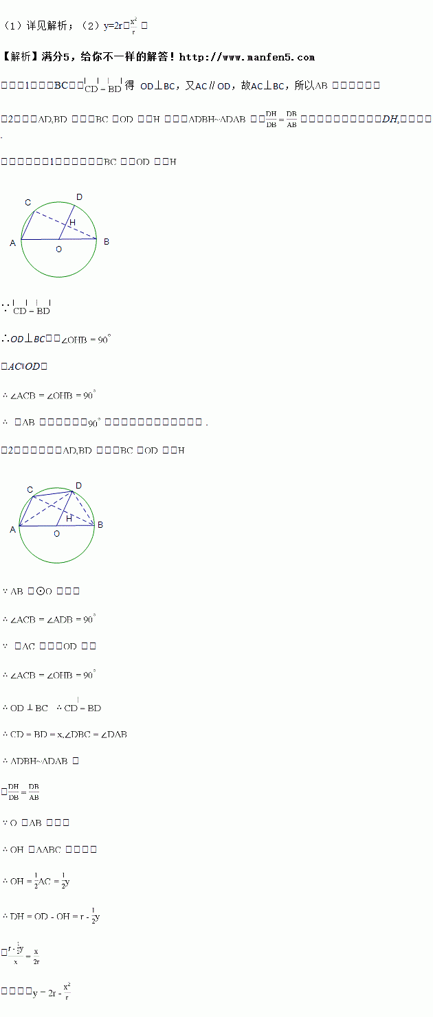 (2)如图2,AB是⊙O的直径,弦AC与半径OD平行.已知圆的半径为r,AC=y,CD=x,求y与x的函数关系式.