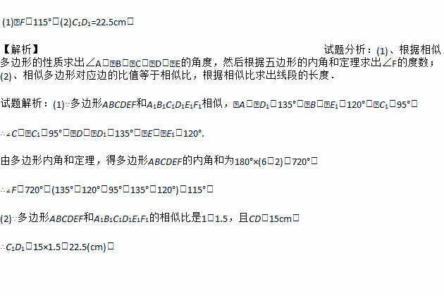 (2)如果多边形ABCDEF和A1B1C1D1E1F1的相似比是1:1.5,且CD=15cm,求C1D1的长度.