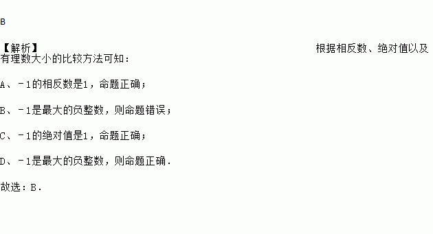 B 【解析】根据相反数、绝对值以及有理数大小的比较方法可知: A、﹣1的相反数是1,命题正确; B、﹣1是最大的负整数,则命题错误; C、﹣1的绝对值是1,命题正确; D、﹣1是最大的负整数,则命题正确. 故选:B.