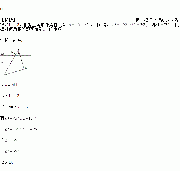 小明同学把一个含有450角的直角三角板在如图所示的两条平行线m,n上,测得 则β的度数是( )