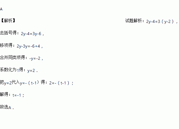 已知y = -(t – 1)是方程2y – 4 = 3 ( y – 2 )的解,那么t的值应该是多少? ( )