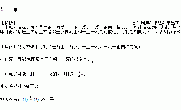 小明和小红玩抛硬币游戏,连续抛两次.小明说:“如果两次都是正面,那么你赢;如果两次是一正一反,则我赢.”小红赢的概率是__________,据此判断该游戏__________(填“公平”或“不公平”).