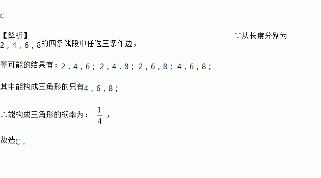 从长度分别为2,4,6,8的四条线段中任选三条作边,能构成三角形的概率为( )