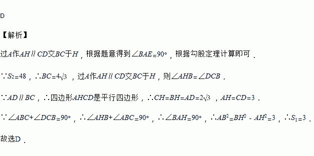 如图,在四边形ABCD中,AD∥BC,∠ABC+∠DCB=90°,且BC=2AD,分别以AB、BC、DC为边向外作正方形,它们的面积分别为S1、S2、S3.若S2=48,S3=9,则S1的值为( )