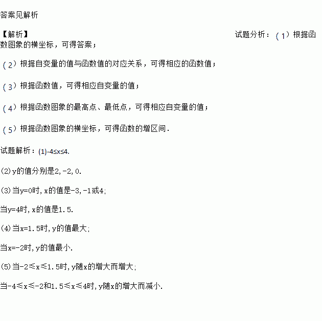 答案见解析 【解析】试题分析:(1)根据函数图象的横坐标,可得答案; (2)根据自变量的值与函数值的对应关系,可得相应的函数值; (3)根据函数值,可得相应自变量的值; (4)根据函数图象的最高点、最低点,可得相应自变量的值; (5)根据函数图象的横坐标,可得函数的增区间. 试题解析:(1)-4≤x≤4. (2)y的值分别是2,-2,0. (3)当y...