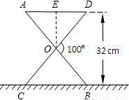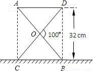某大学计划为新生配备如图(1)所示的折叠椅.图(2)是折叠椅撑开后的侧面示意图,其中椅腿AB和CD的长相等,O是它们的中点.为使折叠椅既舒适又牢固,厂家将撑开后的折叠椅高度设计为32cm,∠DOB=100°,那么椅腿的长AB和篷布面的宽AD各应设计为多少cm?(结果精确到0.1cm)