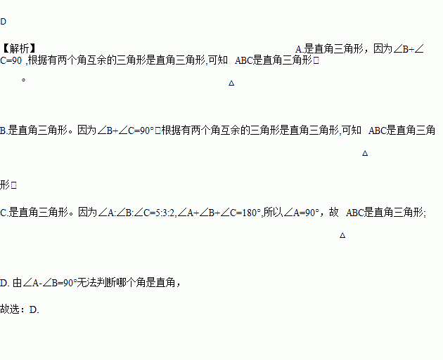 C. ∠A,∠B,∠C的度数比为5:3:2 D. ∠A-∠B=90°