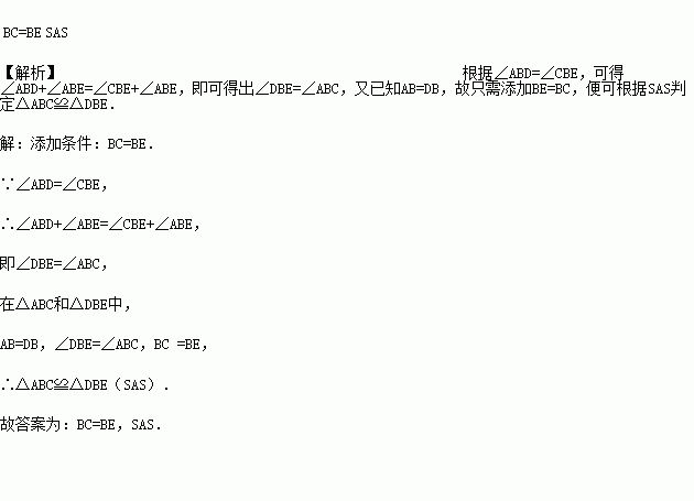如图,AB=DB,∠ABD=∠CBE,请添加一个适当的条件:__(只需添加一个即可),使△ABC≌△DBE.理由是__.